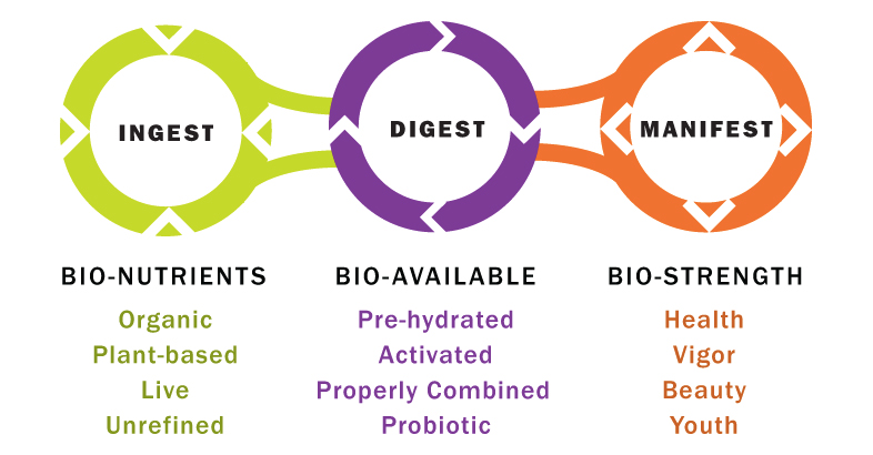 Our products are made to be optimally Bio-Available, and achieve this state through pre-hydrating, activating, properly combining and adding probiotics to our plant foods. This way, freed up energy flows to other important body functions such as detoxification, ongoing cleansing, beautifying functions, immunity and fighting disease.